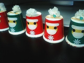 *サンタとトナカイウインナー茶色いウインナー、赤ウインナー、ごま、スライスチーズ、パスタ、ブロッコリーの芯*ウインナーをカットして、パスタで留めて作製w