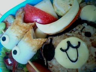 枝豆、ちくわ、きゅうり、スライスチーズ、海苔*人参は三日月型チーズの土台に使ってますw*野菜の肉巻き豚肉切り落とし、人参、ブロッコリーの芯、塩・こしょう、甜麺醤(液体タイプ)*甜麺醤を使うと子供好みの味噌田楽に近い甘辛味噌味にw*きのこソテー舞茸、冷凍パプリカ(3色)、塩・こしょう、醤油*卵焼き卵、マヨネーズ、塩、枝豆*枝豆は薄皮を取ってみじん切りしてます。*ウインナー*キャベツの千切り、茹で野菜(ブロッコリー)*りんご盛りだくさんになっちゃった