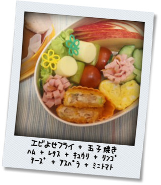 *卵焼き卵、だしの素、塩*エビ寄席フライ冷凍食品*野菜ピックキャンディーチーズ、塩茹でアスパラ、ミニトマトキャンディーチーズは室温に戻してから、チーズをにぎるようにして