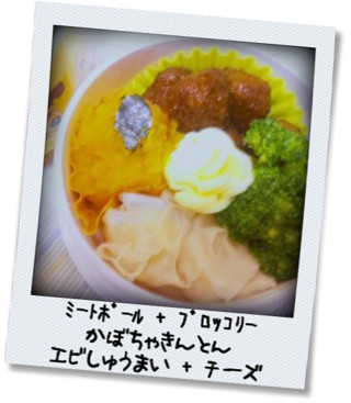 *ブロッコリー、エビしゅうまい、ミートボール冷凍食品*かぼちゃきんとん冷凍かぼちゃ、砂糖、シナモンチン!してつぶしたかぼちゃにシナモンと砂糖を混ぜる。