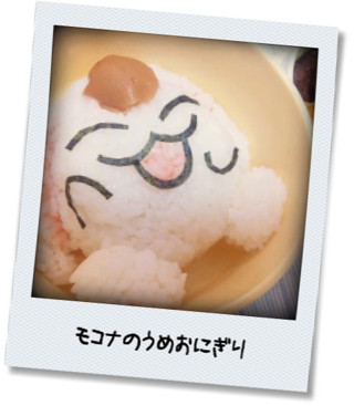 ■□■メニュー ■□■*モコナの梅おにぎりご飯、デコふり(ピンク)、梅干、海苔、塩ラップに塩を振り、ご飯をのせて丸く成型する。耳もにぎる。