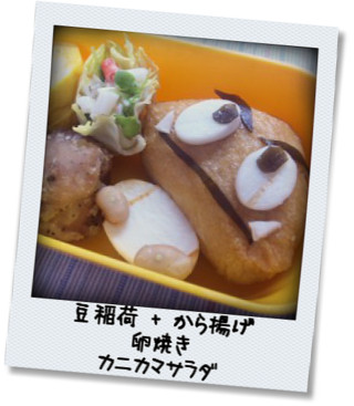 ■□■メニュー ■□■*豆稲荷クリボー豆ごはん(大豆)、稲荷用おあげ、佃煮昆布、はんぺん、そうめん(乾麺)冷凍保存していた豆ごはんをお稲荷さんのおあげにつめて、三角にしてそうめんでとめる。
